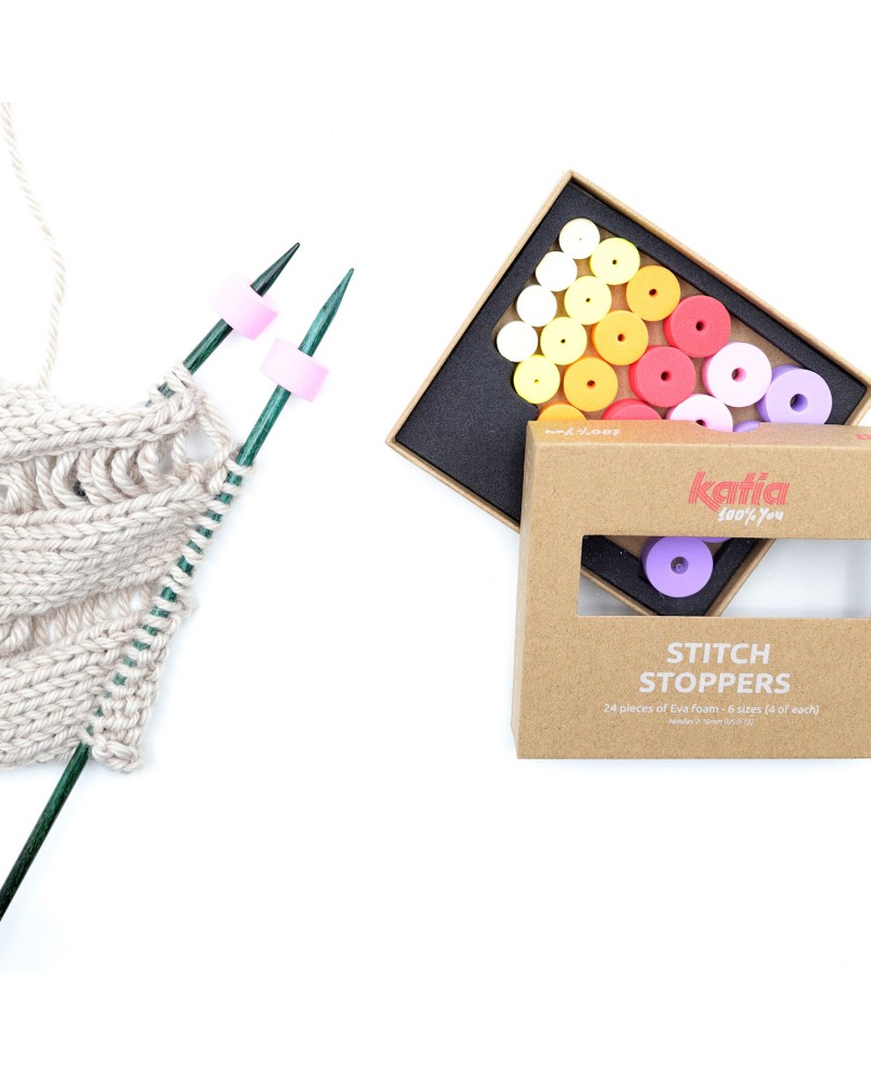 24 stoppers de colores para agujas de punto de diferentes medidas presentados en una caja de cartón kraft. Guarda todas tus labores de punto con seguridad y un toque de color con estos protectores de goma EVA. Introduce la punta de tus agujas por el agujero central de estos topes cilíndricos de foam y deslízalos fácilmente gracias a su flexibilidad. Las distintas medidas de estos protectores se ajustan a tus agujas perfectamente, conservando la labor en espera, sin miedo a perder puntos. Tienes 24 stitch stoppers o topes de agujas de punto para escoger, ¡4 por medida en 6 medidas diferentes! Úsalos con todo tipo de agujas de punto: rectas, circulares y de doble punta desde el número 2 al 12. ¡La vida tejedora es más fácil con los divertidos accesorios Katia!