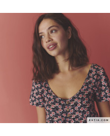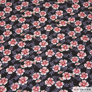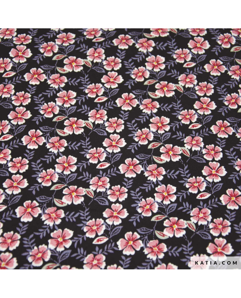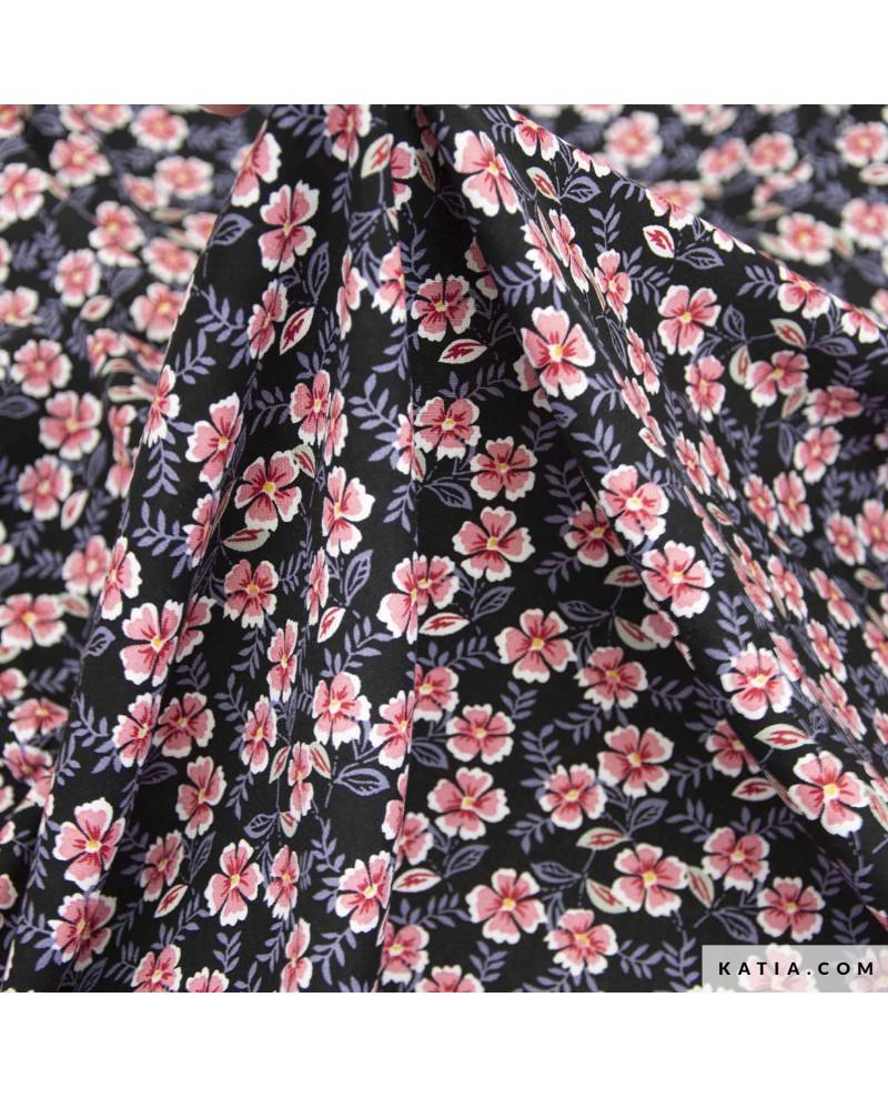 Tela 100 % viscosa con estampado de flores sobre un fondo negro. Es una tela con mucha caída, ligera y fluida, perfecta para coser vestidos, blusas, pantalones y faldas con movimiento. La tela Viscose Print Summer Night Flowers de Katia Fabrics es un tejido fresco y no elástico, reconocido por su caída impecable y un peso de 95 g/m². Su ligereza garantiza una comodidad inigualable en los días cálidos primavera y verano. En la revista de patrones de costura Travel Postcards Primavera-Verano 24 de Katia Fabrics encuentra patrones para coser prendas perfectas para esta tela de viscosa estampada..