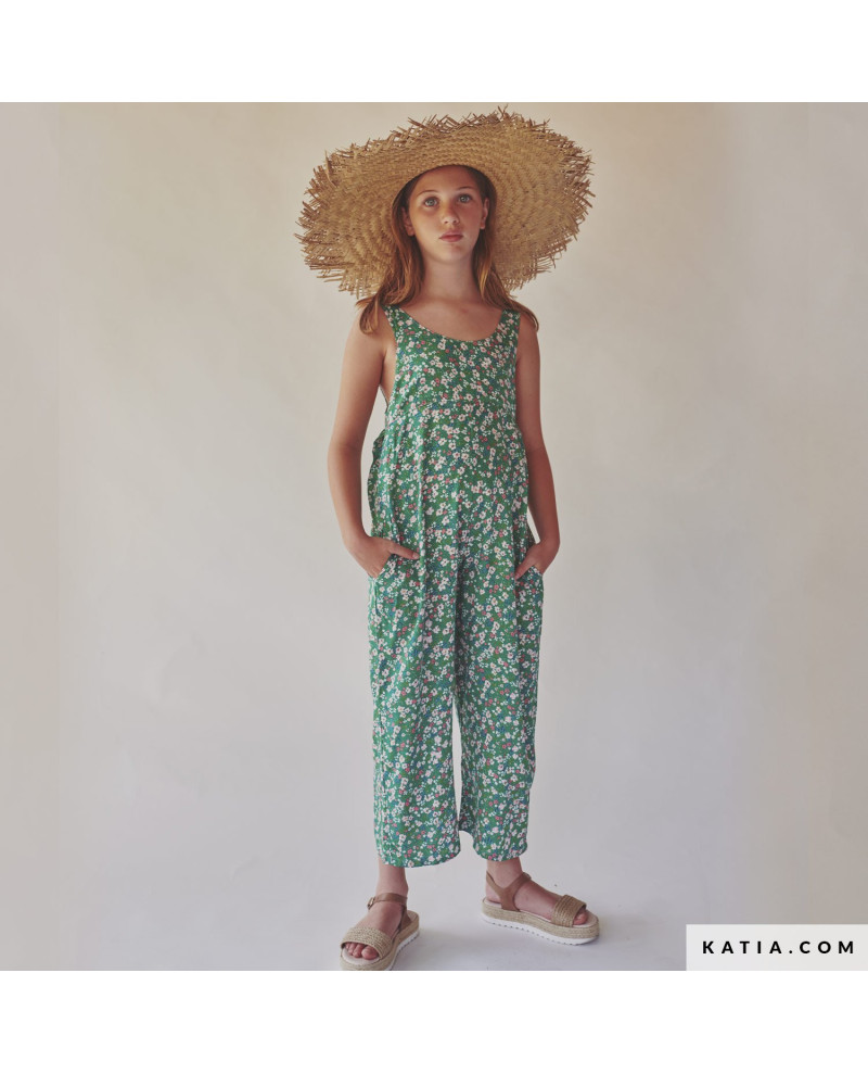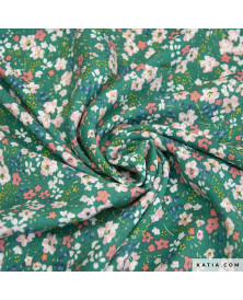 Tela 100 % viscosa con estampado de flores sobre un fondo verde. Es una tela con mucha caída, ligera y fluida, perfecta para coser vestidos, blusas, pantalones y faldas con movimiento. La tela Viscose Print Summer Flowers de Katia Fabrics es un tejido fresco y no elástico, reconocido por su caída impecable y un peso de 95 g/m². Su ligereza garantiza una comodidad inigualable en los días cálidos primavera y verano. En la revista de patrones de costura Travel Postcards Primavera-Verano 24 de Katia Fabrics encuentra patrones para coser prendas perfectas para esta tela de viscosa estampada.