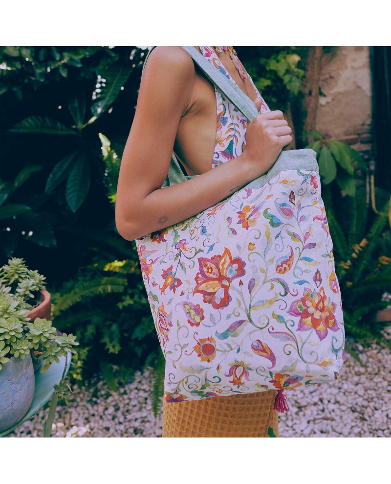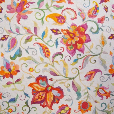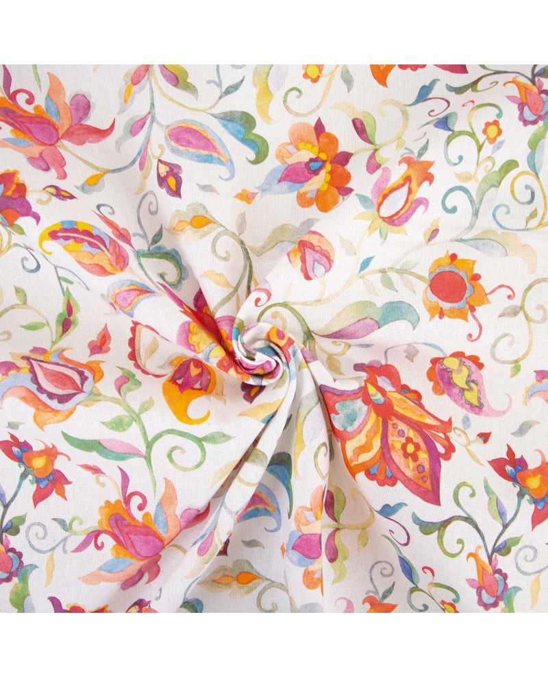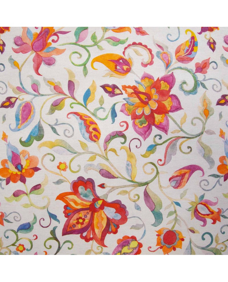 Tela de loneta reciclada por metros con un espampado de flores en tonos naranjas, amarillos, rojos y verdes sobre un fondo color blanco. La tela de loneta Canvas Recycled Print Spring Time de Katia Fabrics es una tela de gran calidad, muy resistente y de aspecto natural que es perfecta para crear accesorios, un espectacular mantel, cojines o fundas de sofá para decorar tu hogar. Composición: 84% Algodón Reciclado, 8% Poliéster Reciclado, 6% Algodón y 2% Poliéster; Ancho: 140 cm. Gramaje: 194 gr/mt2. Lavable a máquina 40º. No lejía. Secar en la sombra. Secar en secadora a baja temperatura. Planchar máx. 150º.