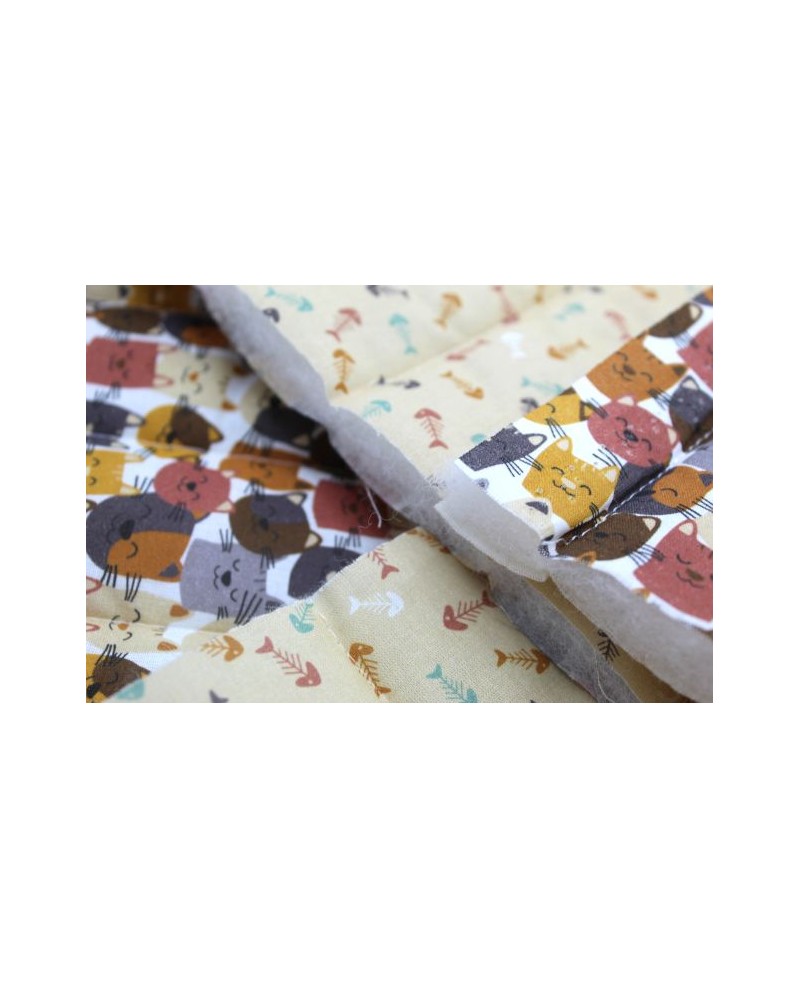 Tela de gatos acolchada reversible con tela de espinas de pescado. Tela ideal para coser accesorios a tus mascotas. Composición 60% Algodón y 40% poliester; Ancho: 140cm. Gramaje: 380gr/mt2. Lavable a máquina. Centrifugado corto. No lejía. No secar en Secadora. Lavable en seco. No Planchar.