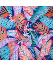 Descubre la energía vibrante del verano con esta tela, un estampado exótico y colorido que invita a crear prendas únicas para disfrutar del sol y el agua. Su diseño de hojas tropicales en tonos coral, aqua y verde menta sobre fondo azul marino es perfecto. Este tejido técnico está pensado para ropa de baño. Su tacto suave y alta calidad lo convierte en la opción ideal para quienes cosen sus propios looks veraniegos. Ya sea para confeccionar un bikini a medida, o un conjunto de playa completo con pareo, la tela de baño Tortoise Leaves es la elección perfecta para quienes buscan estilo y funcionalidad. Composición: 82% Poliamida y 18% Elastán; Ancho: 150 cm. Gramaje: 200 gr/mt2. Lavable a máquina 30º. No lejía. Secar en secadora temperatura baja. No Planchar.