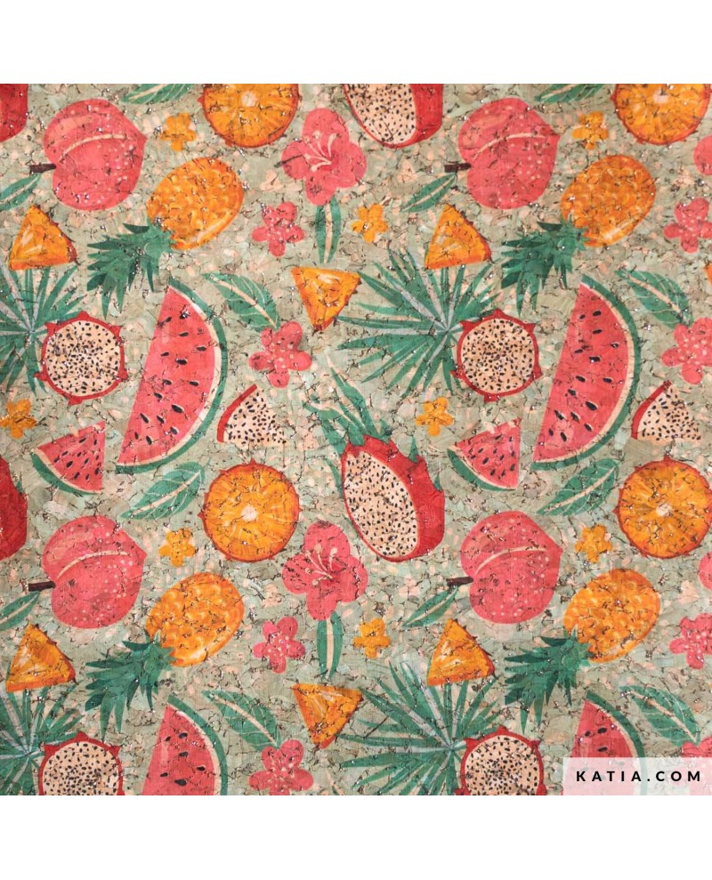 Con el tejido de corcho Cork Print Summer Fruits de Katia Fabrics podrás disfrutar de todas las características del corcho, pero con el fácil manejo de un tejido. Cose accesorios y complementos con este divertido tejido.