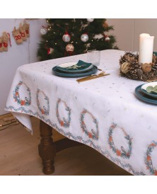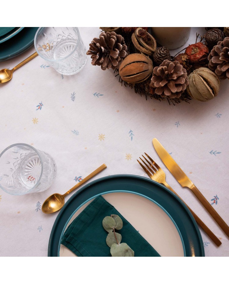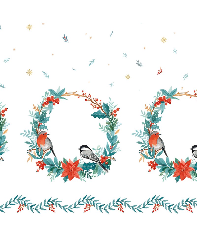 Tela de loneta 100 % algodón, con dibujo de flores de Navidad y elementos navideños sobre un fondo blanco. El tejido de loneta Canvas Xmas Birds Placed de Katia Fabrics es una tela de algodón de gran calidad, fina y suave que cuenta con un diseño de flores que se repite en los dos orillos de la tela, así que es la tela perfecta para crear un espectacular mantel para decorar tu mesa de Navidad.