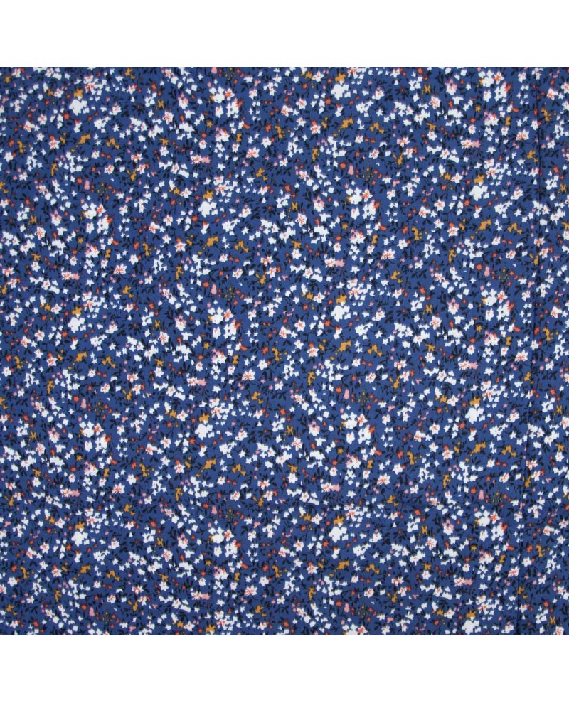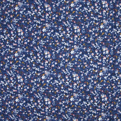 Tela 100 % Viscosa con un bonito estampado floral sobre un fondo azul. El tejido de viscosa Viscose Print Night Flowers de Katia Fabrics tiene una caída espectacular, por tanto, es muy adecuada como tela para coser blusas y vestidos. Un tejido no elástico de gran suavidad que cautiva por su ligereza y delicadeza. Déjate sorprender por esta viscosa tan bonita y agradable a la piel de Katia Fabrics.