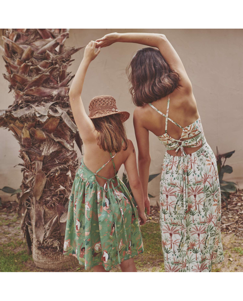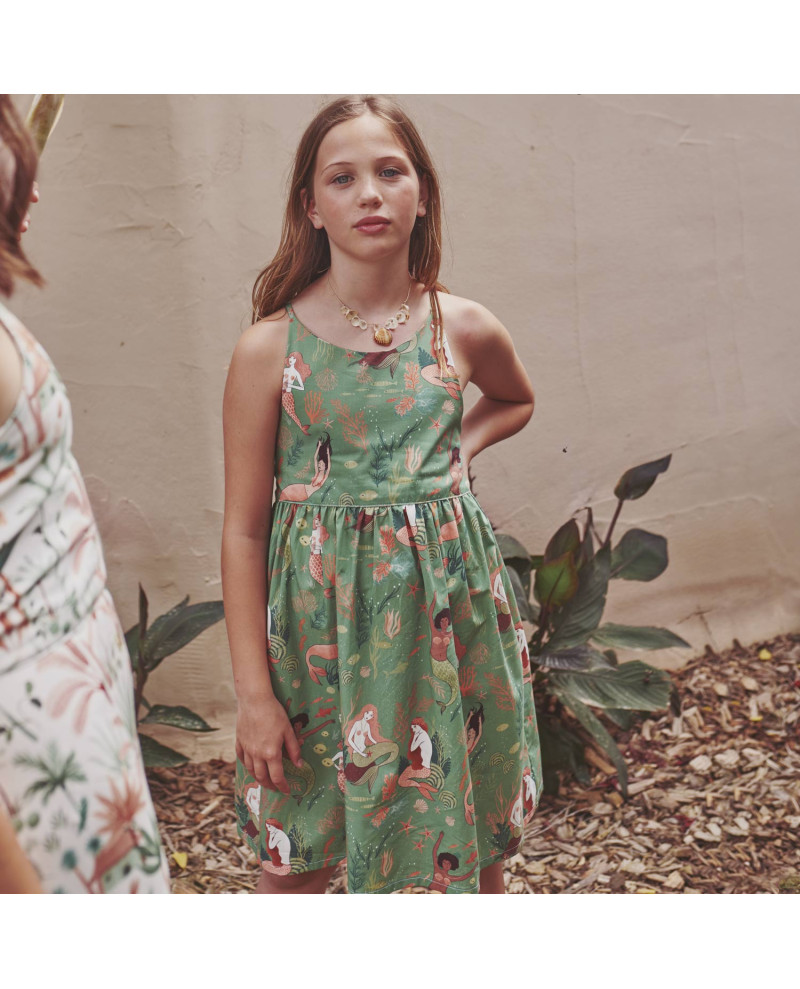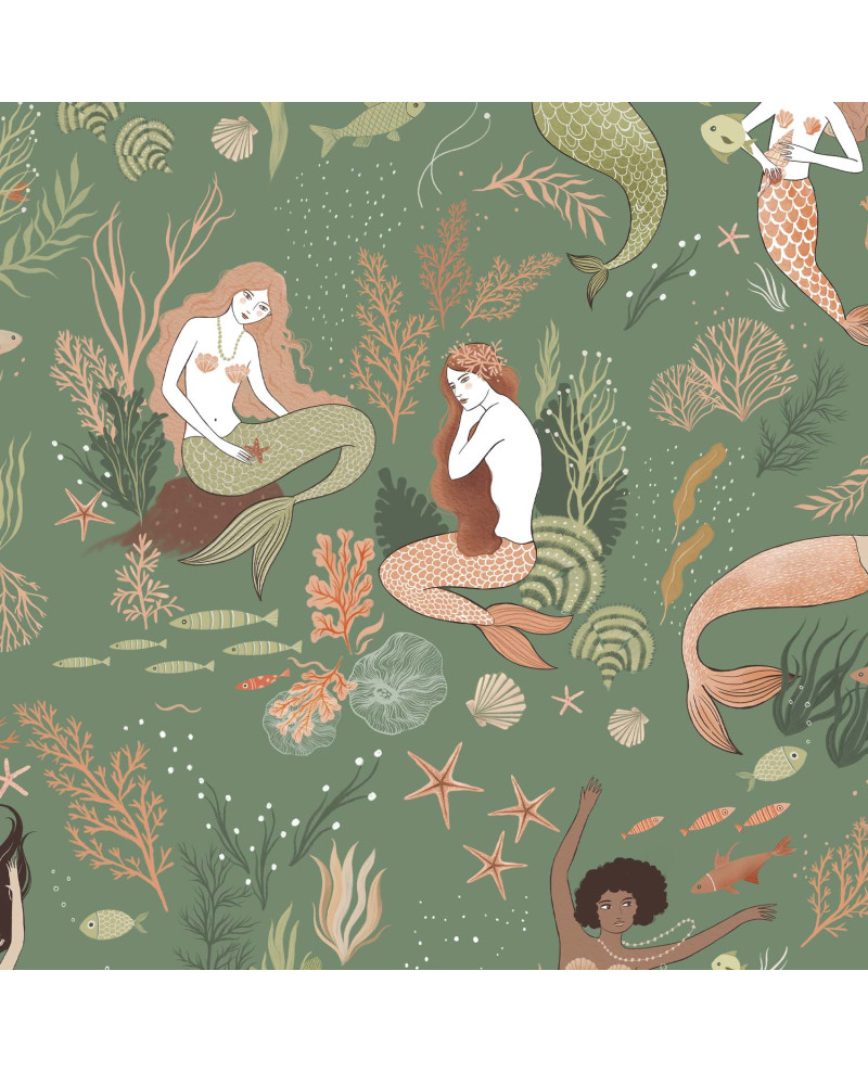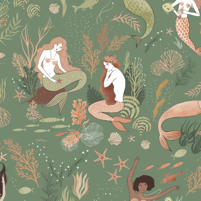 Tela de popelín con un estampado de sirenas, peces y corales sobre un fondo verde. Por su suavidad es perfecta para confeccionar vestidos y camisas para toda la familia en primavera y verano. Su suavidad y ligereza garantizan comodidad, mientras que su estructura transpirable asegura frescura durante todo el día. Es un tejido que cuenta con el certificado Standard 100 by Oeko-Tex® por lo que es una tela perfecta para las pieles más sensibles.