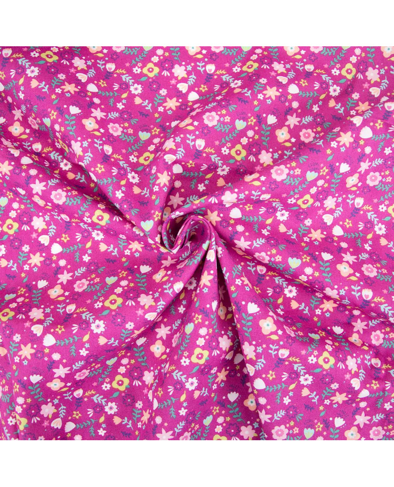 Tela de popelín con un estampado floral sobre un fondo magenta. Por su suavidad es perfecta para confeccionar vestidos y camisas para toda la familia en primavera y verano. Su suavidad y ligereza garantizan comodidad, mientras que su estructura transpirable asegura frescura durante todo el día. Es un tejido que cuenta con el certificado Standard 100 by Oeko-Tex® por lo que es una tela perfecta para las pieles más sensibles.